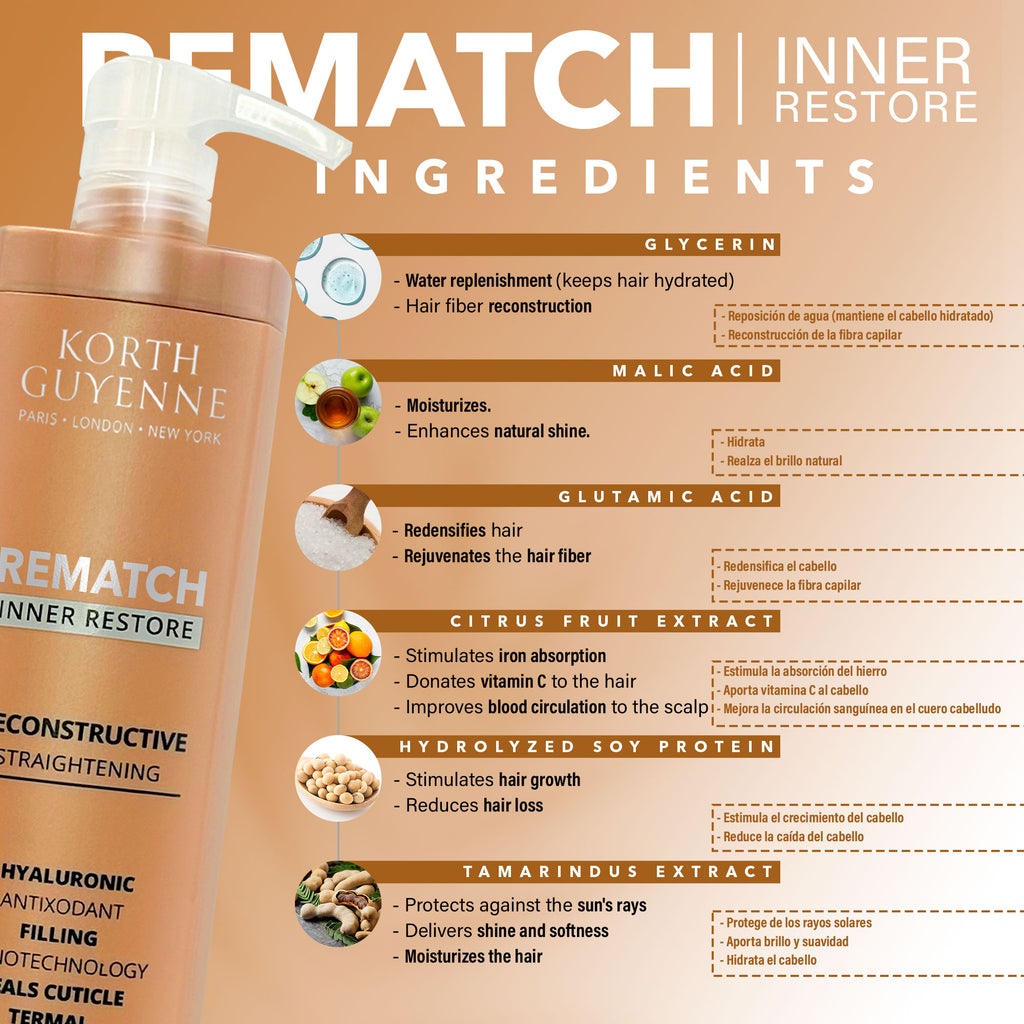 Crafted with powerful ingredients, the Korth Guyenne Straightening Rematch Inner Restore aligns and smooths the hair, restoring its uniformity and restructuring the entire length. This unique formula combines Organic Alpha Hydroxy Acids, which rebuild the hair fiber, with the exclusive Kerascienza Aminé I PROFOND technology, Hyaluronic Acid, and an Amino Acid Blend. This technology not only replenishes amino acids but also safeguards the hair during the straightening process.
