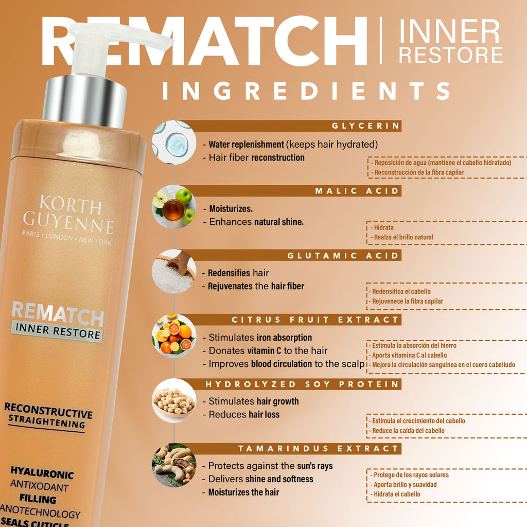 Crafted with powerful ingredients, the Korth Guyenne Straightening Rematch Inner Restore aligns and smooths the hair, restoring its uniformity and restructuring the entire length. This unique formula combines Organic Alpha Hydroxy Acids, which rebuild the hair fiber, with the exclusive Kerascienza Aminé I PROFOND technology, Hyaluronic Acid, and an Amino Acid Blend. This technology not only replenishes amino acids but also safeguards the hair during the straightening process.